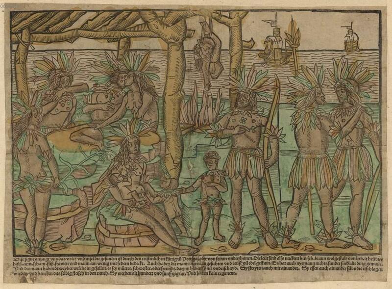 Dise figur anzaigt uns das volck und insel die gefunden ist durch den cristenlichen künig zu Portigal oder von seinen underthonen..., koloriertes Flugblatt (Text: Vespucci), ca. 1503.
